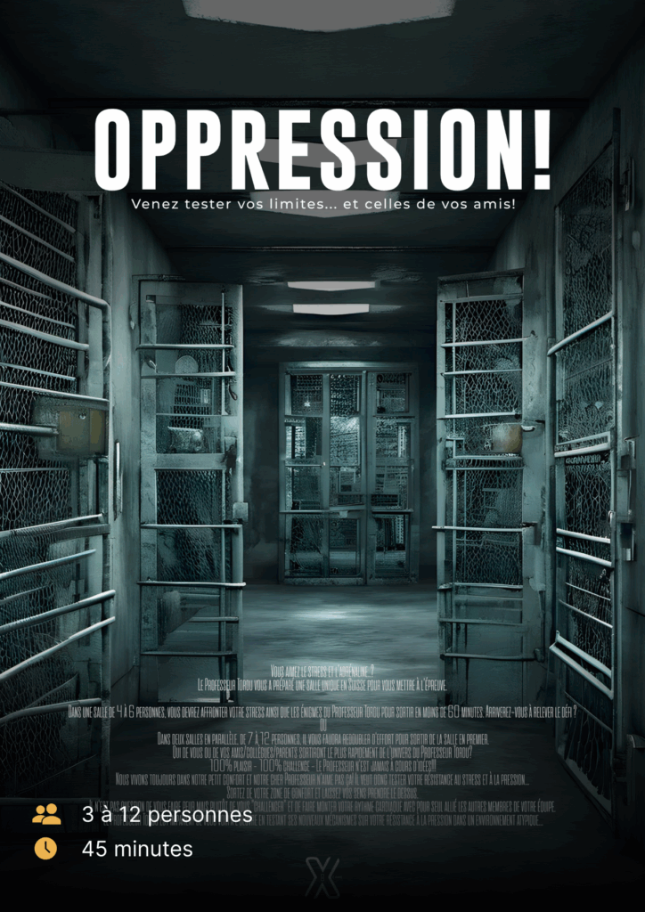 Il n’y a pas d’exercice physique dans nos salles, à l’exception de la salle Oppression! qui offre une expérience plus immersive. Il est toutefois tout à fait possible d’y participer. Merci de nous informer à l’avance si une personne de votre équipe est enceinte, afin que nous puissions adapter le jeu si nécessaire.